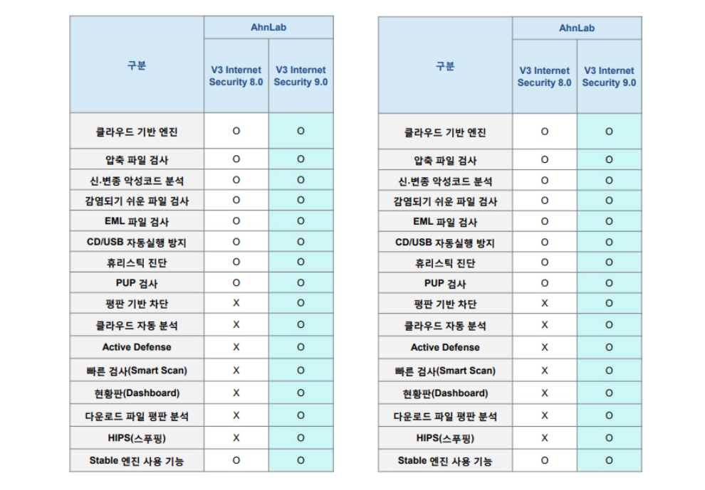 V3 Internet Security 9.0 기능 비교